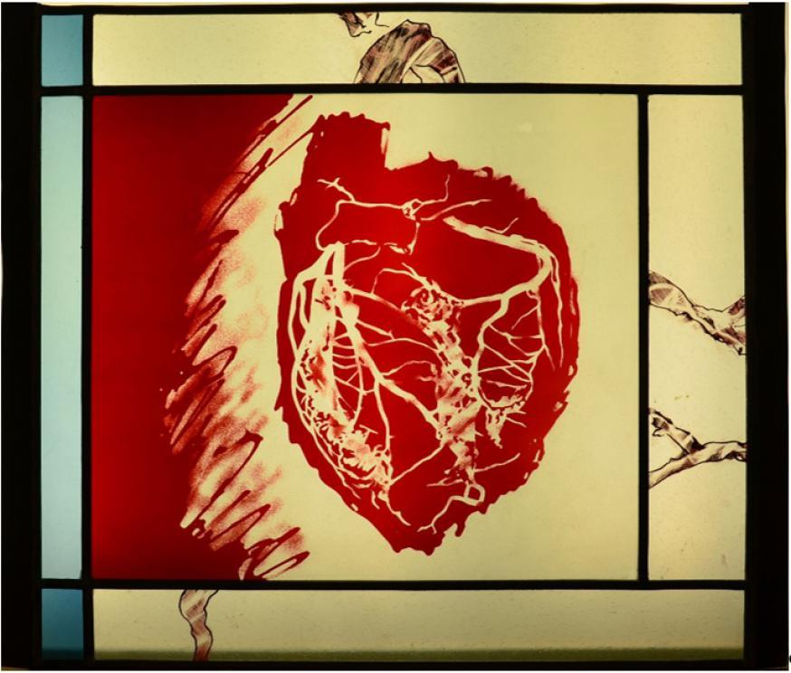 De schenkers, een privé-persoon en twee Aalsterse zustercongregaties, de Zwartzusters en de Hospitaalzusters, kozen voor de respectieve thema’s Onderwijs en Zorg (bijhorende foto, een hart, toont een detail uit het glasraam rond zorg). Na een open oproep reageerden een 8-tal kunstenaars, waarvan er drie door een jury werden geselecteerd. De keuze van de Kerkfabriek viel op Mieke Verwaetermeulen van het glasatelier Atrium uit De Pinte, die met haar creatie tegemoet komt aan alle voorwaarden van de opdracht.